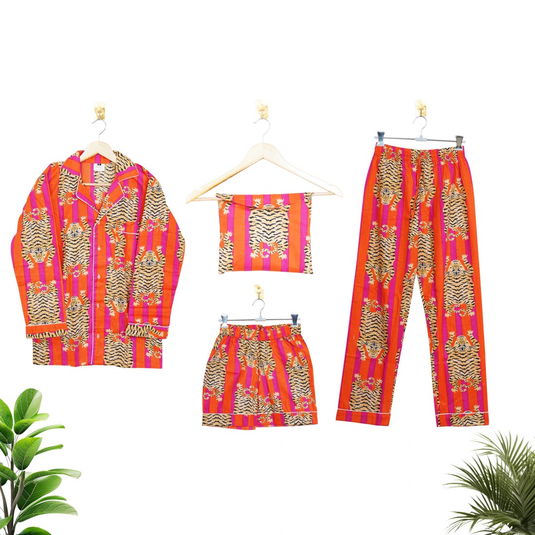 Home / Tiger Print Pajamas, Cotton Printed Night Suit, Indian PJ Set, Lounge Night Dress, Pajamas 4 Pcs Set